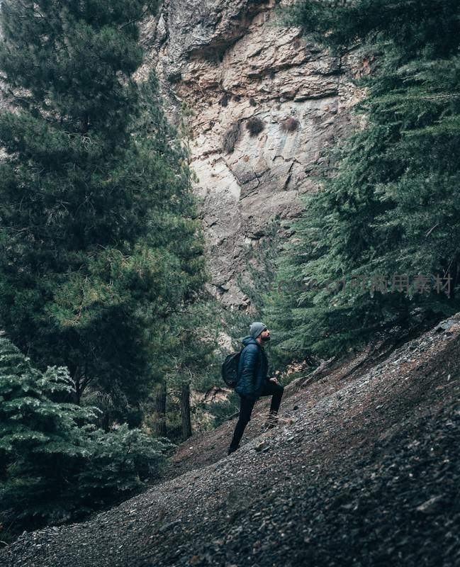 一位戴着帽子的徒步者正沿着布满碎石的陡坡向上攀登,两侧是茂密的针叶林,背后是高耸的岩壁。画面充满野性与挑战,展现深入自然腹地的冒险精神。