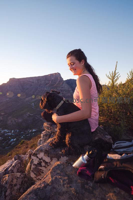 山顶日落时分,女孩与爱犬共享宁静时光