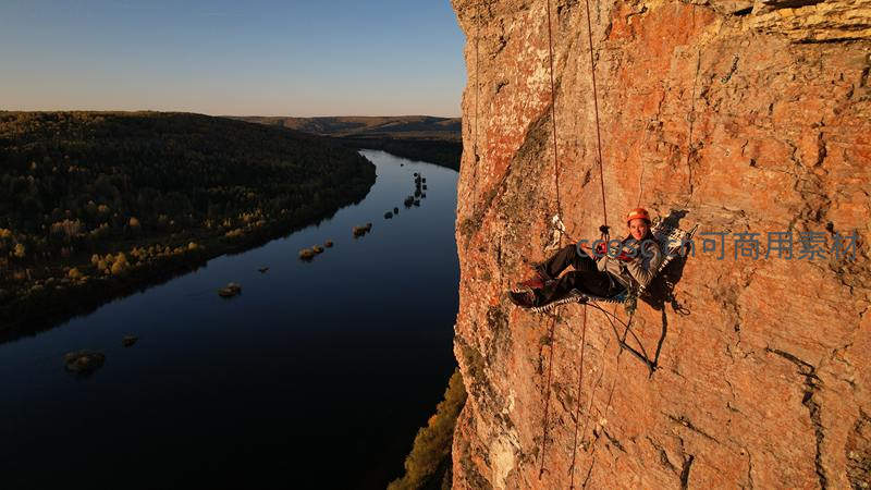 攀岩者悬于峭壁之上俯瞰蜿蜒河流