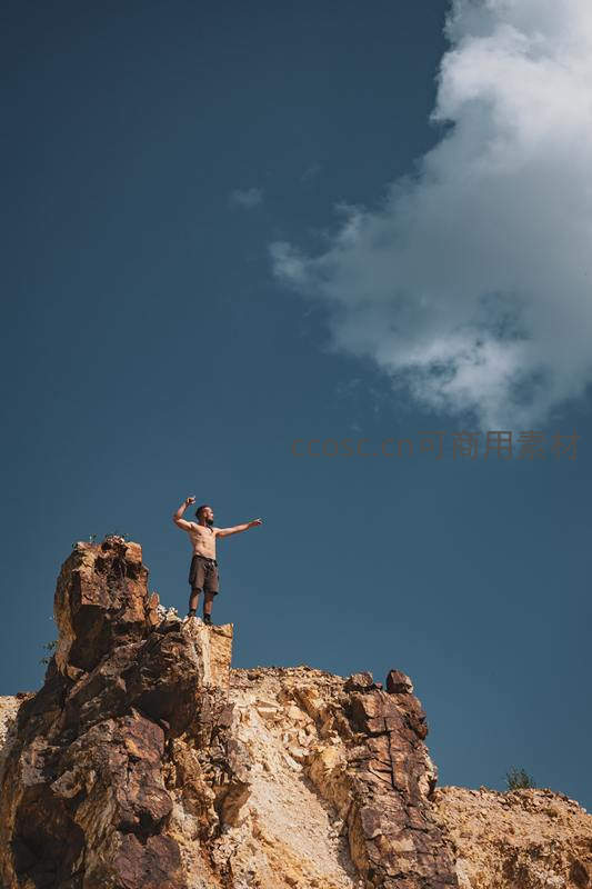 一名赤裸上身的男子站在高耸的岩石顶端,双臂张开拥抱天空,背景是湛蓝晴空与洁白云朵,象征征服自然后的豪迈与自由。