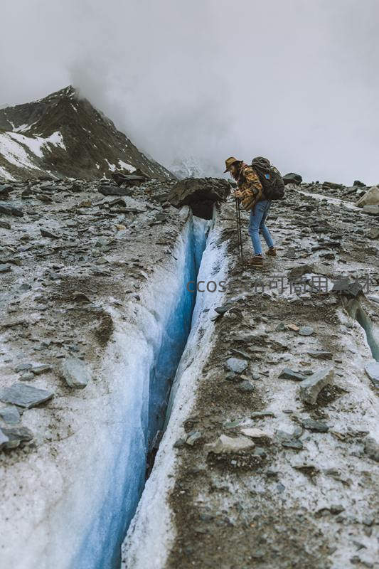 一名背包客谨慎地跨过一条深邃的蓝色冰川裂缝,四周是裸露的岩石和积雪,展现了高海拔地区徒步的惊险与壮丽。