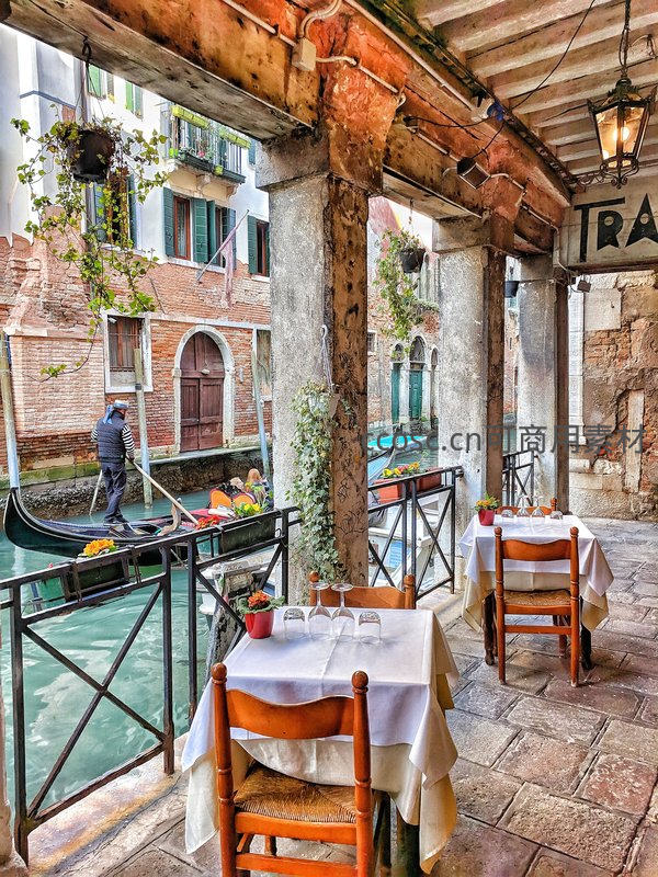 古老的石柱与藤蔓环绕着运河边的露天餐桌,一艘贡多拉正缓缓驶过,浓郁的意式风情与水城的宁静在此刻完美交融。