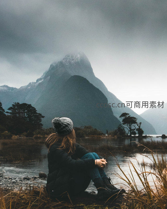 一位穿着冬装的旅人安静地坐在湖边,仰望着被云雾笼罩的巍峨山峰,画面充满诗意与沉思,展现了人与自然的和谐对话。