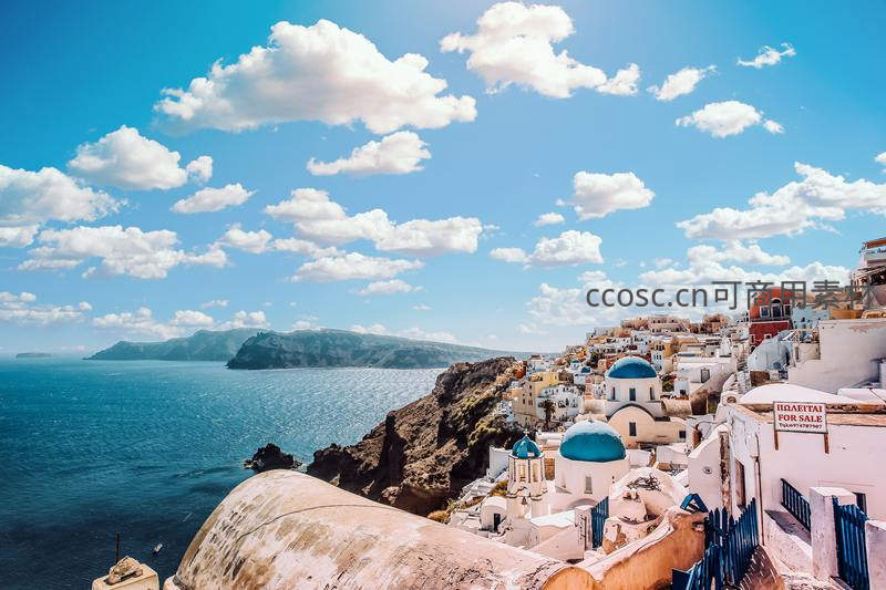 阳光明媚的圣托里尼岛上,白色房屋与蓝色穹顶教堂依山而建,俯瞰碧蓝爱琴海,远处岛屿与朵朵白云构成绝美地中海画卷。