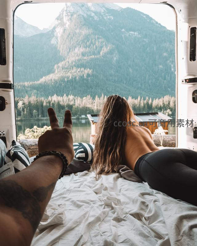 从房车内部向外看,一对情侣在床铺上欣赏壮丽的山景和宁静的湖水,享受自由自在的旅行生活。
