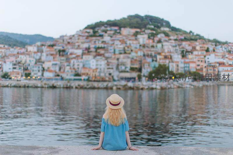 女孩静坐水边眺望山城小镇