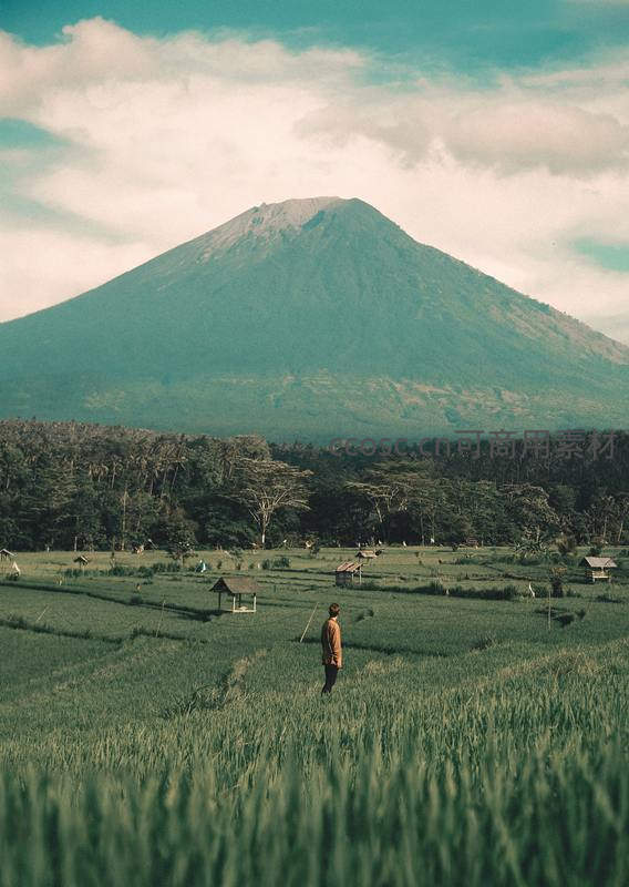 广袤的绿色稻田延伸至远方,一座巍峨的火山静静耸立于天际。一人漫步其中,享受着远离尘嚣的宁静,与大自然融为一体。