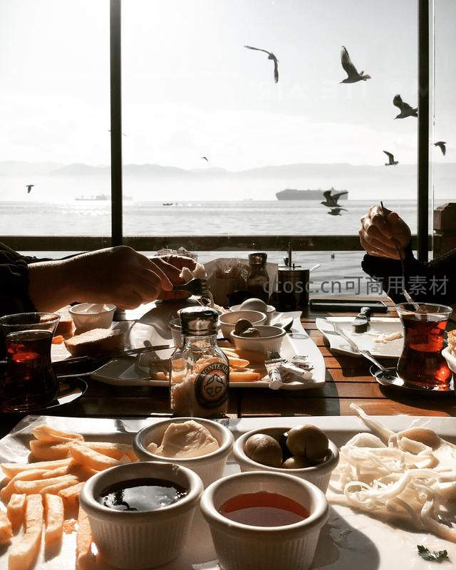 海边餐厅享用丰盛早餐看海鸥