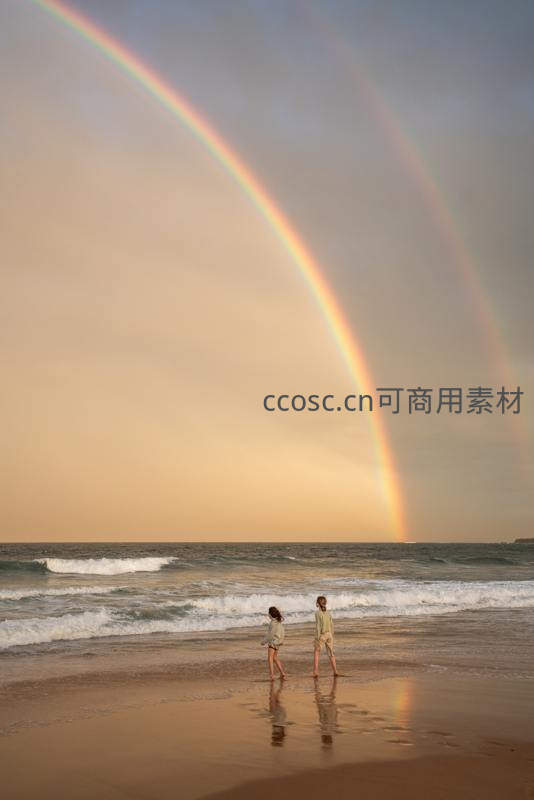 一对情侣在湿润沙滩上并肩漫步,头顶一道清晰双彩虹横跨天际,金色余晖洒满海面,浪花轻拍脚踝,空气中弥漫着童话般的浪漫气息。