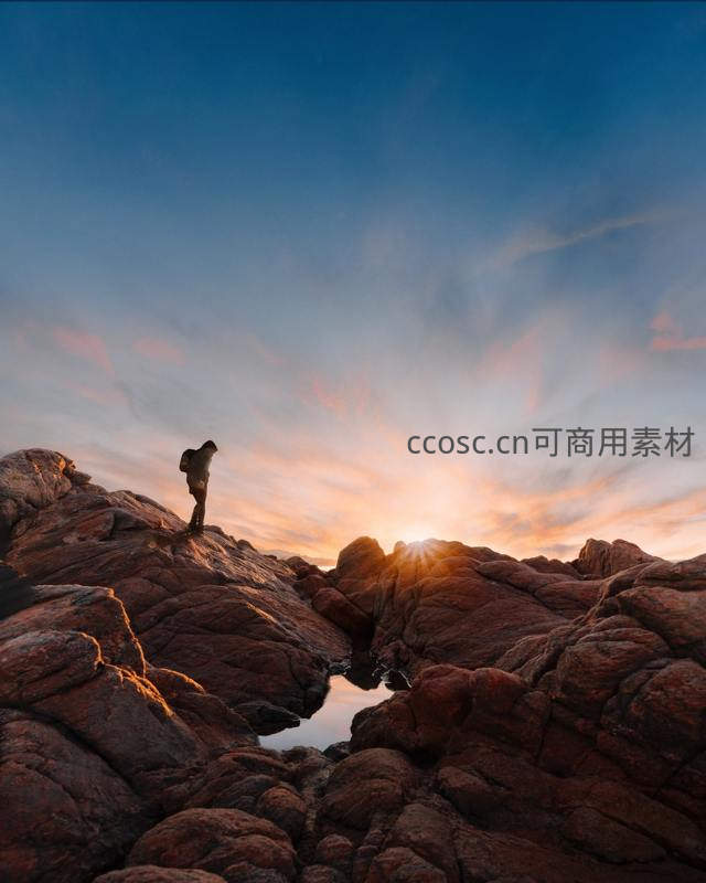 一人背负行囊,伫立于嶙峋的红色岩石之上,凝望远方绚烂的日落。天空被晚霞染成橙红与深蓝交织的画卷,充满宁静与壮阔之感。