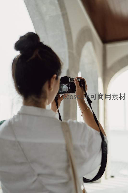 一位年轻女子背对镜头,手持相机,正专注地拍摄前方具有现代设计感的拱形建筑结构。柔和的光线透过空间,营造出宁静的艺术氛围。