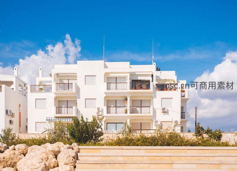 一排纯白色现代公寓楼沐浴在晴朗蓝天之下,阳台绿植点缀其间,前方石阶与野花相映,散发浓郁的地中海度假气息与生活美学。