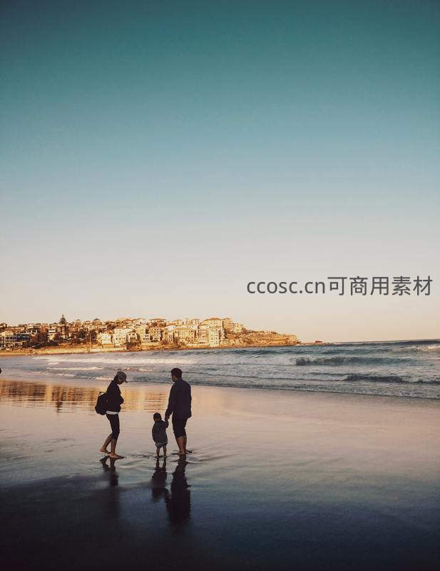 一家三口在金色夕阳下的湿润沙滩上牵手漫步,身后是宁静的海浪和远处依山而建的小镇,温馨的亲子时光与自然美景融为一体。