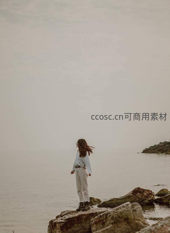 一名女子独自站在海边的礁石上,迎着薄雾远眺大海,白色衣裤与灰蒙天空形成对比,营造出静谧而略带忧郁的氛围。