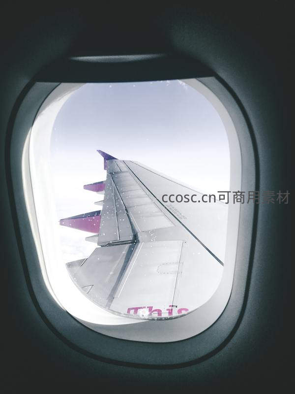 透过飞机舷窗,银色机翼划破云层,紫色翼尖在阳光下格外醒目,记录下一段云端之上的旅程与自由心境。
