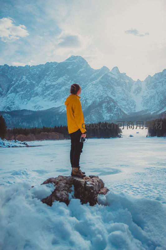 一位身穿亮黄色冲锋衣的摄影师站在冰封湖面旁的岩石上,远眺连绵起伏的雪山,蓝天白云映衬下,人与自然构成一幅壮丽而宁静的冬日画卷。