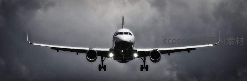 一架大型客机正迎着乌云密布的天空准备降落,前照灯穿透黑暗,展现出力量与科技感并存的震撼瞬间。