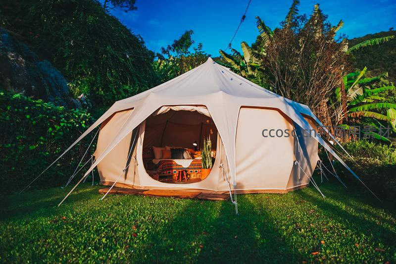在郁郁葱葱的热带丛林中,一顶宽敞舒适的豪华帐篷静立于草坪之上,内部陈设温馨,是远离尘嚣的理想避世之所。