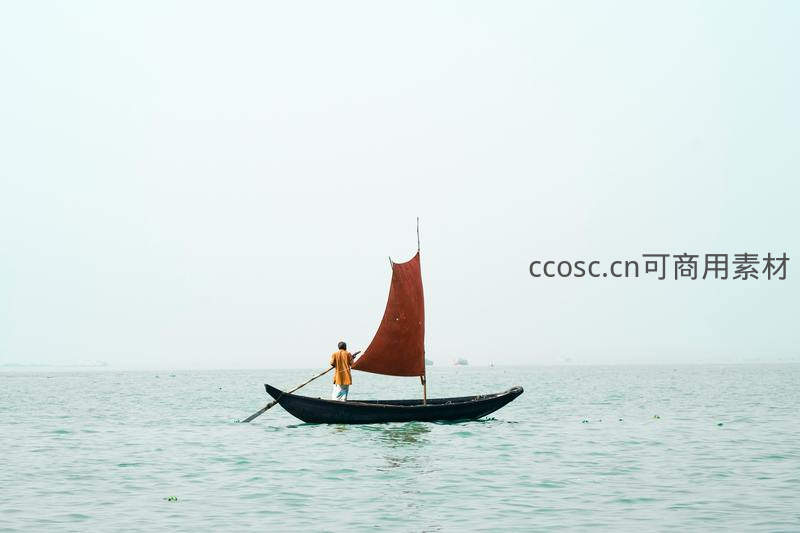 一叶扁舟扬起红色风帆,在辽阔平静的海面上缓缓前行,远处水天相接,尽显渔舟唱晚的诗意与悠然自得。