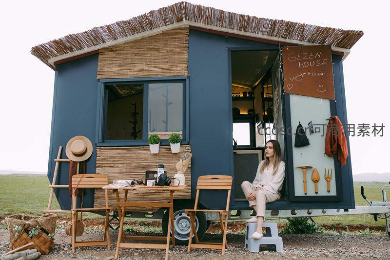 一位女子悠闲坐在改装房车门口,身旁摆放着木桌椅与咖啡器具,背景是开阔草地,展现惬意自在的移动生活方式。