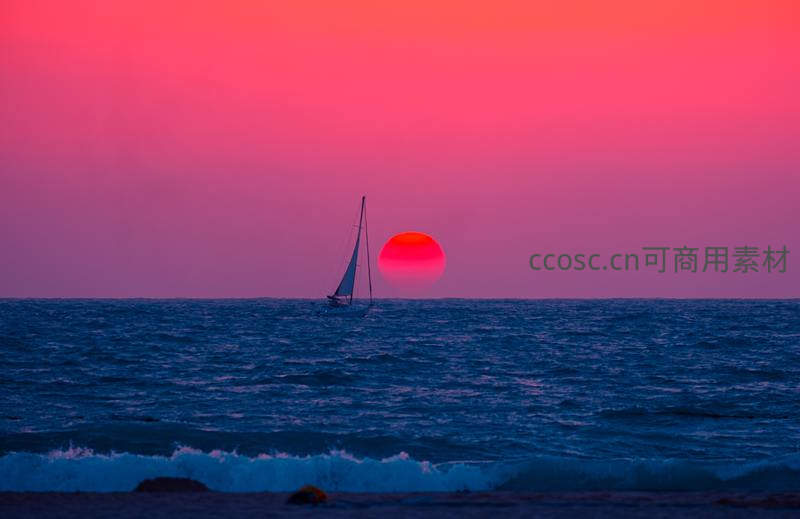火红夕阳沉入海平线,染红半边天空,一艘帆船静静航行于波光粼粼的海面,勾勒出宁静而诗意的黄昏画卷。