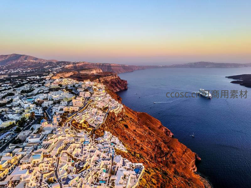 圣托里尼日落航拍,白屋蓝海如梦似幻