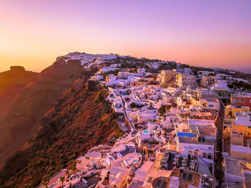 粉紫霞光映衬圣托里尼,白墙屋舍如童话世界