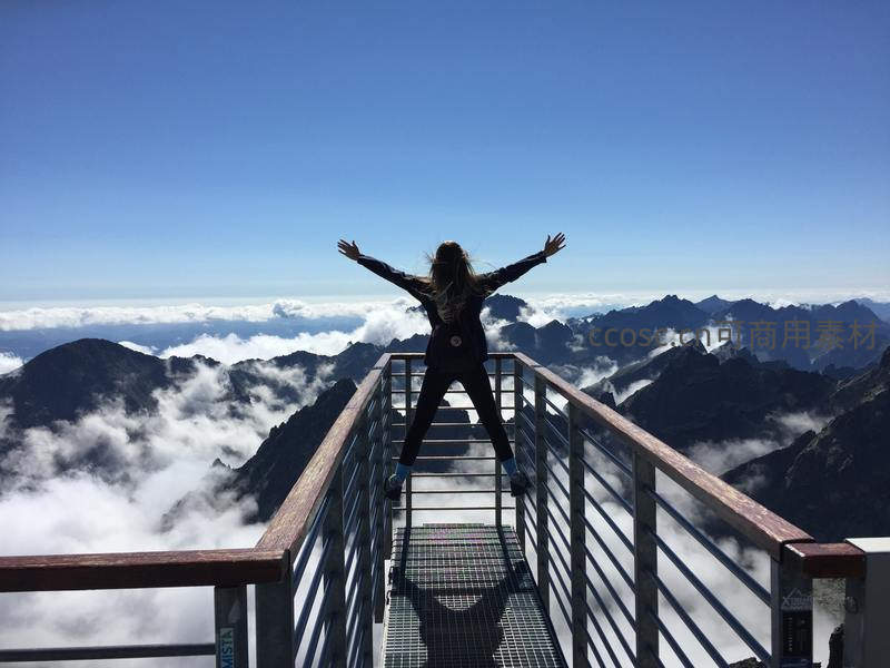 一名游客站在高山观景栈道上,双臂张开面向连绵起伏的云海和群山,蓝天如洗,气势恢宏,尽显征服自然后的豪迈与喜悦。