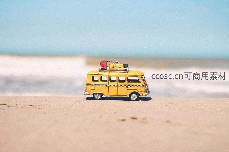 一辆小巧的黄色巴士模型停在细腻的沙滩上,背景是波光粼粼的大海和晴朗天空,仿佛正准备开启一场夏日海滨冒险之旅,充满童趣与度假气息。