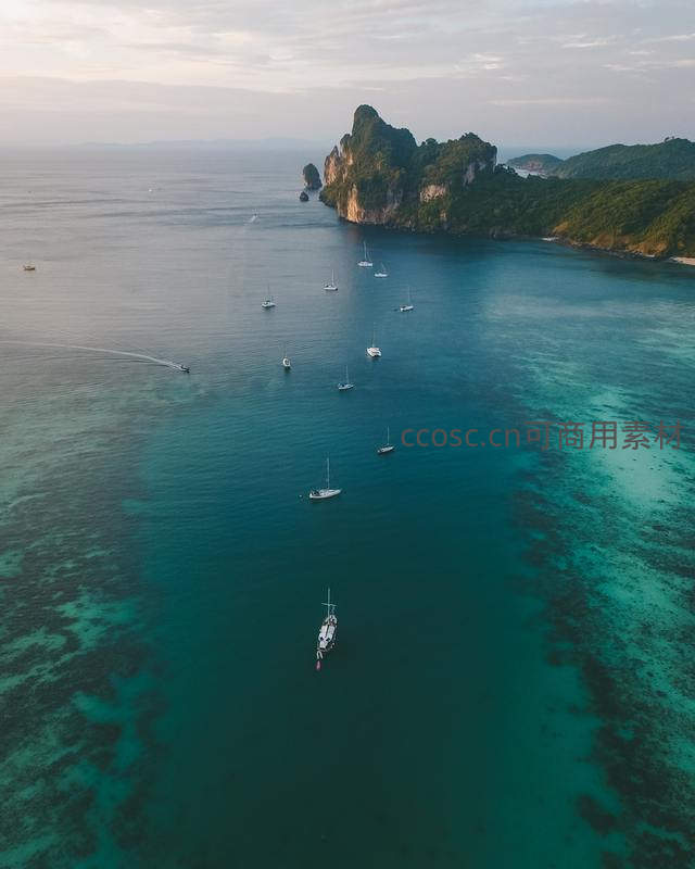 高空俯瞰清澈见底的碧蓝海域,数艘白色帆船散落其间,远处是郁郁葱葱的石灰岩岛屿,云层低垂,营造出静谧而壮丽的热带海洋画卷。