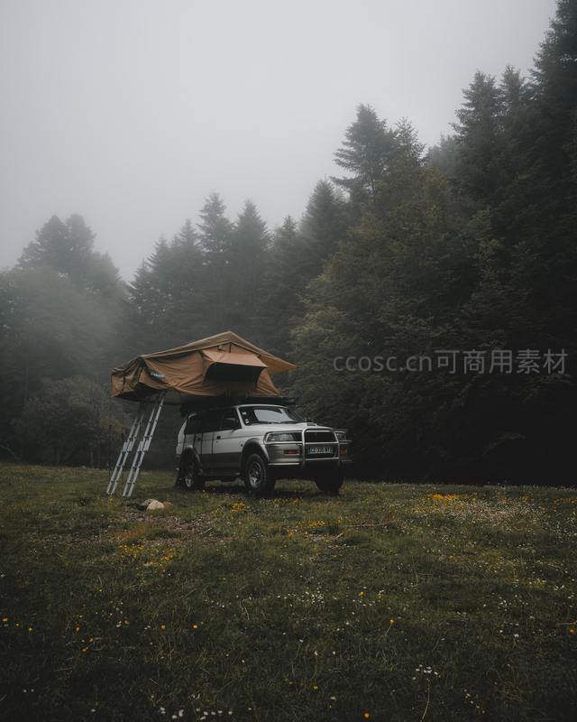 雾中森林越野车顶帐篷露营