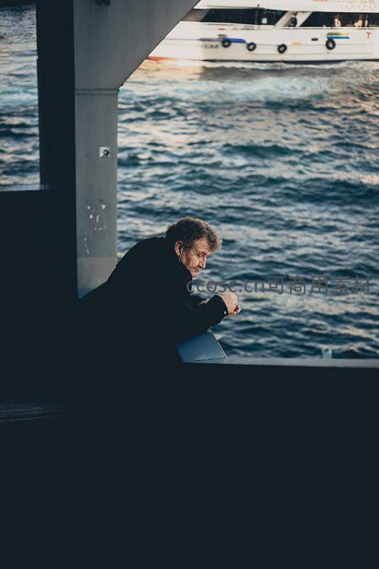 一位老人在码头的阴影下静静凝视着远方,背景是波光粼粼的水面和驶过的游船,画面充满沉思与宁静的氛围。