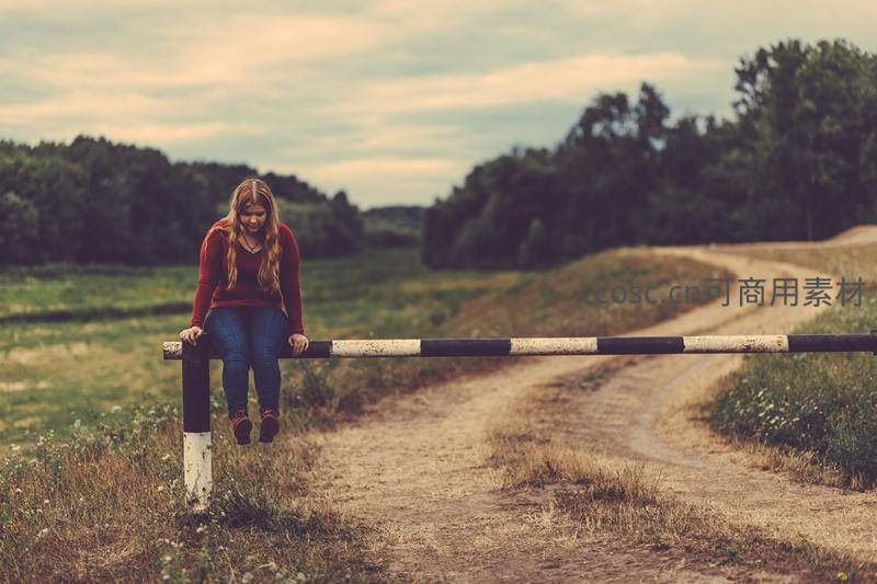 一位年轻女孩身穿红色上衣,坐在黑白相间的乡间栅栏上,低头凝视,身后是蜿蜒土路和绿意盎然的田野,远处树林朦胧,充满怀旧与沉思的田园气息。
