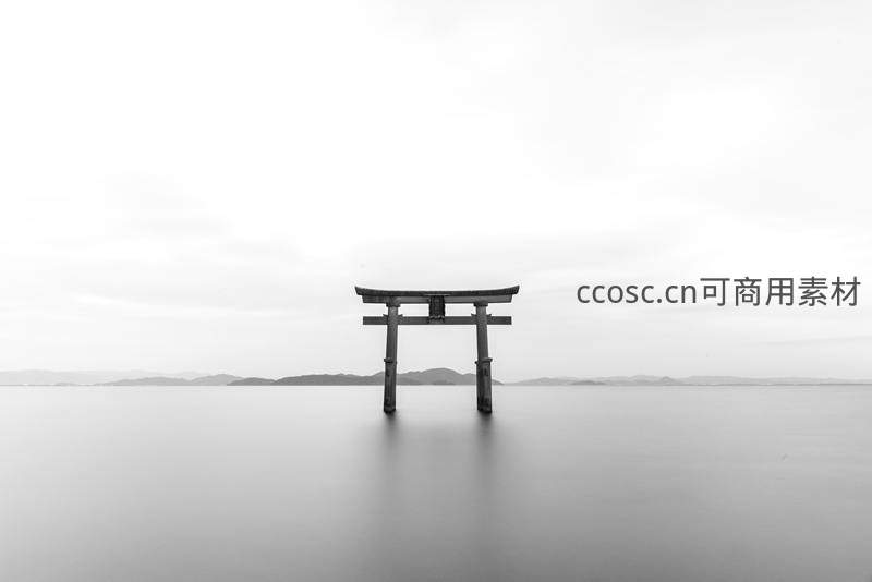 黑白画面中鸟居静立水面如镜