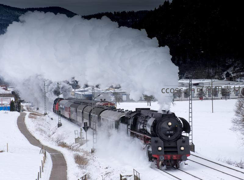 老式蒸汽机车在皑皑白雪覆盖的山谷中疾驰,巨大的白色蒸汽云团弥漫天空,与深色山林和村庄形成强烈视觉对比,充满怀旧气息。