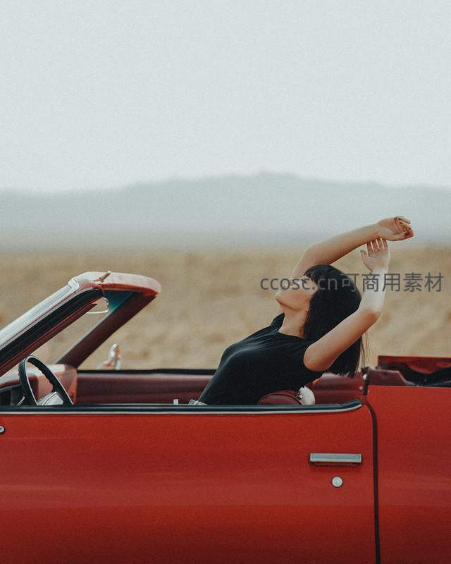 红车敞篷中女子舒展双臂,享受旷野自由