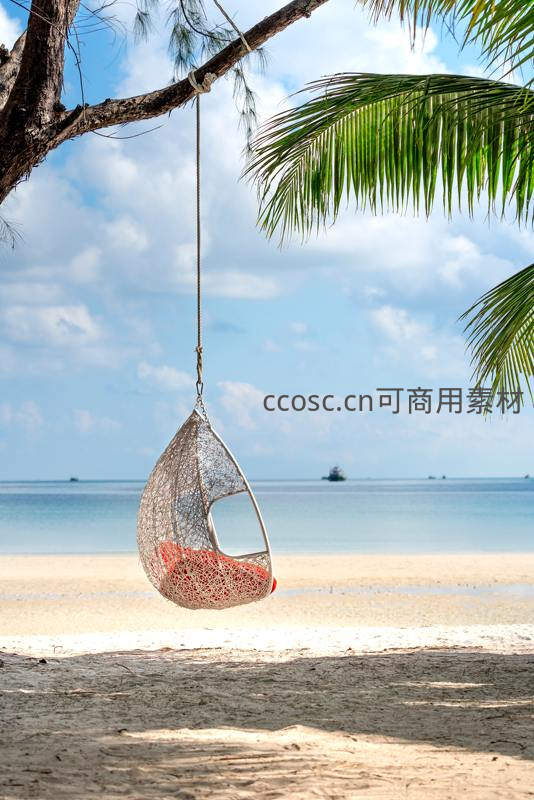 一个编织吊篮悬挂在棕榈树下,内衬橙色软垫,面对碧海白沙,远处帆影点点,是理想中的海岛慢生活写照。