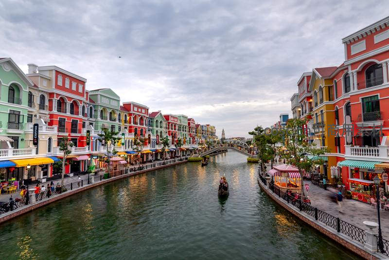 宽阔的运河两侧排列着红、黄、绿等鲜艳色彩的欧式建筑,拱桥横跨水面,游船点缀其间,构成一幅宁静而浪漫的城市画卷。