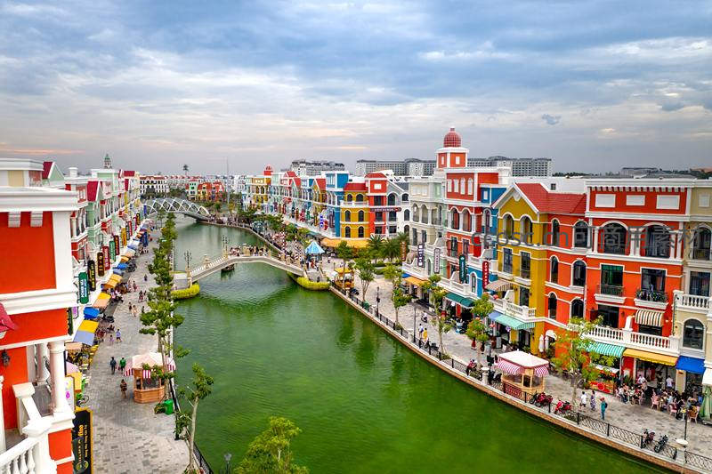 从高空俯瞰,蜿蜒的绿色运河贯穿整个彩色建筑群,拱桥连接两岸,行人熙攘,展现出一个充满活力与童话色彩的现代水城景象。