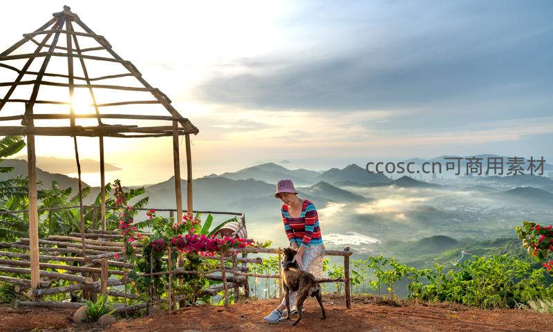一位女士带着爱犬站在山顶的竹制凉亭旁,俯瞰被晨雾笼罩的山谷与远方城市,阳光穿透云层洒下金色光辉,画面宁静而壮美。