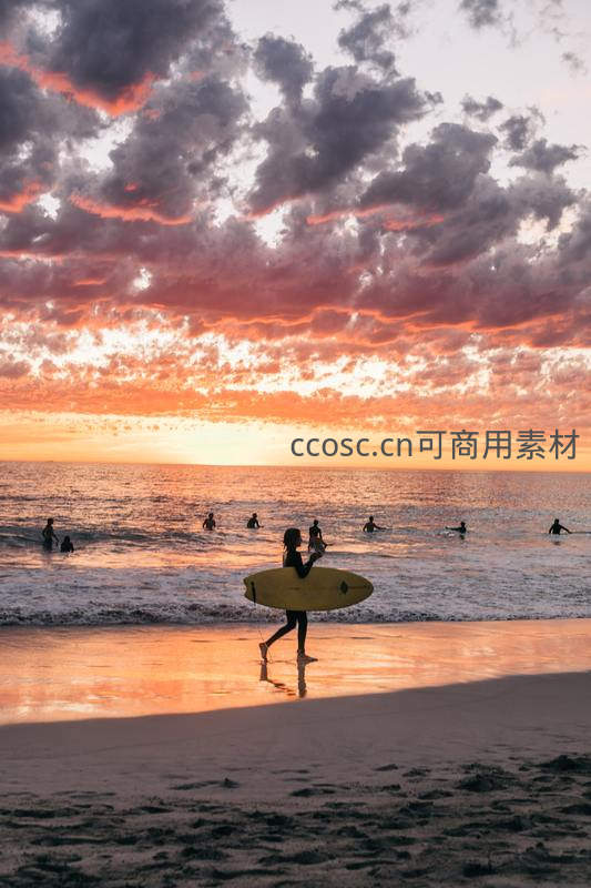夕阳海滩冲浪者,剪影踏浪归岸时