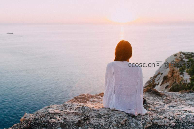 白衣女子静坐悬崖边凝望海上日落
