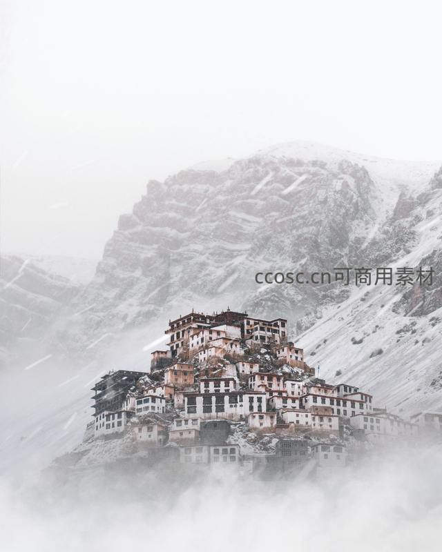 雪雾缭绕中的山巅古寺,宛如仙境秘境