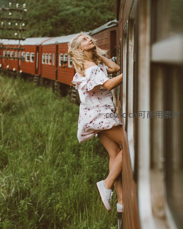 一位金发少女从行驶中的复古火车窗探出身子,迎着微风,背景是绿意盎然的田野,展现了旅途中的自由与诗意。