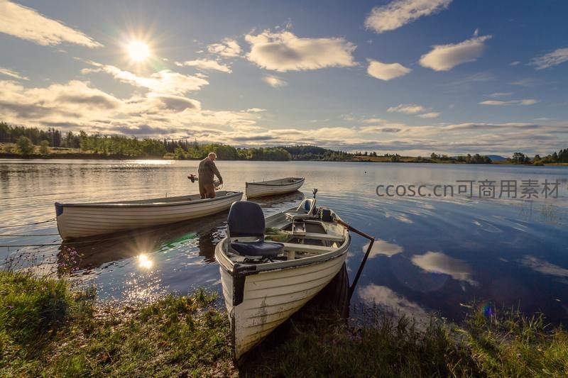 湖畔夕阳下渔夫与小船的宁静画卷