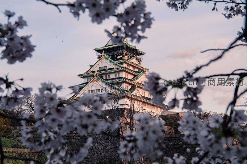 樱花枝头掩映下的大阪城,春日浪漫景致