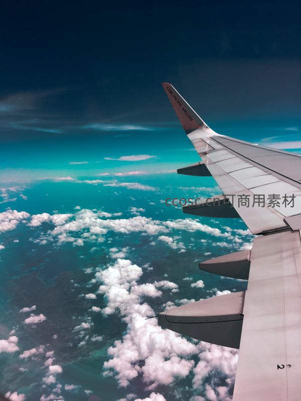 从飞机舷窗向外望去,洁白的云朵如棉花糖般铺满下方,蔚蓝的天空一望无际,银色的机翼划破长空,带来征服天空的自由感与壮阔视野。