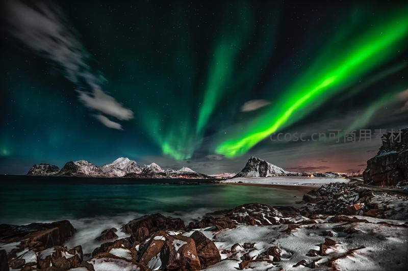 绿色极光在雪覆山峦与海岸上空舞动,星光点点,海浪轻拍礁石,构成一幅梦幻而壮丽的北欧冬夜画卷。