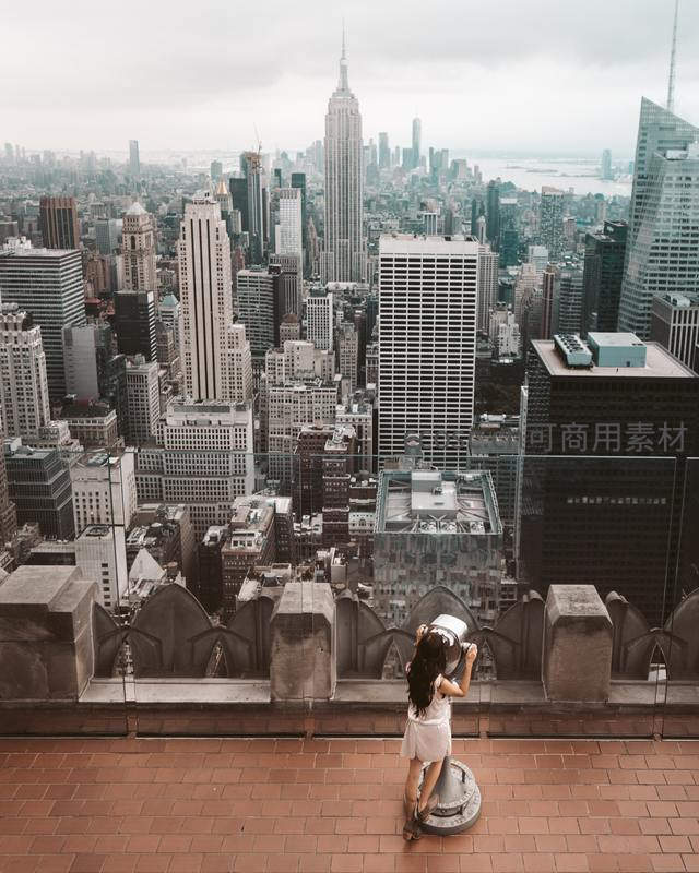 从高处俯瞰纽约曼哈顿,帝国大厦矗立中央,摩天大楼林立,一名女子在观景台上拍摄这壮丽的城市全景。