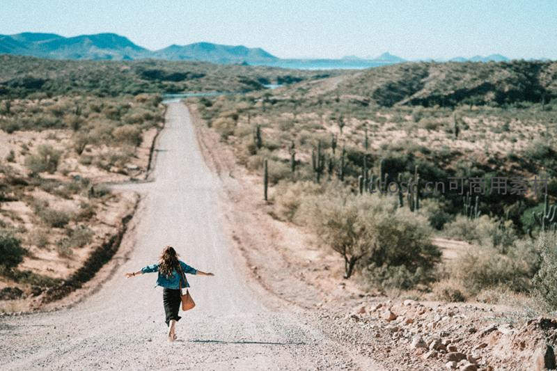 一位女子张开双臂在荒凉的沙漠公路上奔跑,两旁仙人掌点缀,远山如黛,阳光洒落,诠释着无拘无束的旅行精神。